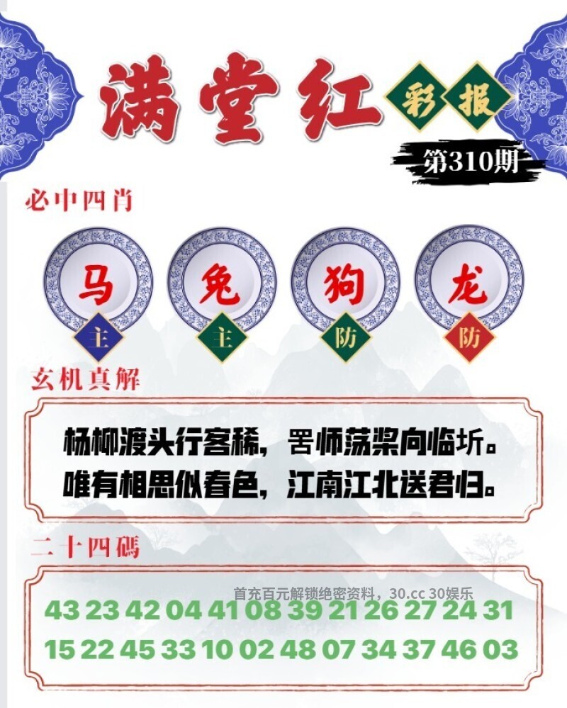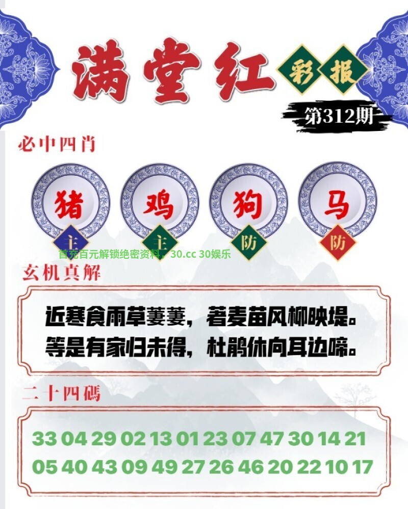313期满堂红彩报:荷叶生时春恨生,荷叶枯时秋恨成。深知身在情长在,怅望江头江水声。 六肖:马猪龙猴鸡羊 三肖:马猪龙 特码:24.36.07.43.02.38.10.22.21.33.23.35 |